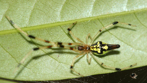 說明:圖為華麗金姬蛛雌蛛。雌蛛體長約6-8mm,背甲淡紅褐色。第一步足明顯較長。腹部金黃色,具有黑色斑紋,相當亮麗,因而得名。雄蛛體長約4-5mm,體色和花紋與雌蛛相同,但腹部稍微細長。分佈於低海拔地區。喜歡出現在溪流邊或河岸附近的樹木、灌叢等葉背。雌蛛有護卵及護幼行為。
