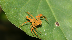 說明:圖為豹紋貓蛛雌蛛。雌蛛體長約10-14mm。背甲為黃色或橘色,與腹部背面一樣具有許多綠色花紋,斑紋顯眼狀似花豹而得名。腹部長卵形。腳頗長,具有長刺,前三對步足往往靠近,而與第四對步足離得很開。分佈於台灣各地區,低海拔較常見。平常在草叢或灌叢枝葉間徘徊尋找獵物。雌蛛將卵囊產在葉背,會伏在上方護卵。