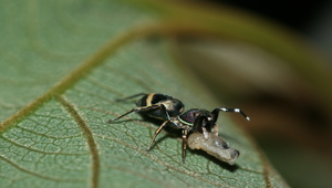 說明:圖為藍翠蛛,正在捕食。雄蛛體長約5-6mm。背甲為黑褐色,被有藍色金屬光澤的毛,側緣具水藍色細紋,細紋上方可見磚紅色毛。步足灰褐色,第一步足特別發達,同樣被有藍色金屬光澤的毛。腹部呈橢圓形,黑褐色,也有藍色金屬光澤的毛,有時可見兩條帶狀橫紋。時常在螞蟻容易出現的地面、石頭或木頭上徘迴,並不時舉起第一步足,狀似螞蟻的觸角,被認為是對螞蟻的擬態。分布於日本與中國大陸,台灣的紀錄是2002年才被