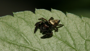 說明:圖為毛垛兜跳蛛雄蛛。雄蛛體長約6-9mm。背甲為黑褐色。腹部略呈三角形,背面具有白色橫紋,但有時模糊或消失。分佈於低海拔地區,經常於地面或枝葉間徘徊尋找獵物。