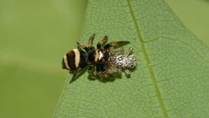 說明:圖為毛垛兜跳蛛雌蛛。雌蛛體長約5-8mm,腹部長橢圓形,底色為深紅褐色,具有乳白色橫帶,配色十分顯眼。分佈於低海拔地區,經常於地面或枝葉間徘徊尋找獵物。圖中雌蛛正在補食眼鏡黑條蠅虎的雌蛛。