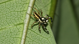 說明:圖為眼鏡黑條蠅虎雄蛛。雌蛛體長約5-6mm。背甲白色或乳白色,胸部背面具有明顯眼鏡狀斑紋,非常容易辨認。雄蛛體型略小,約4-6mm,背甲則為黑褐色,側緣與後緣具有白邊,腹部背面黃褐色,中央具有一條寬大的縱帶。雌雄蛛因體色差異大,常被誤認為不同種。分佈於低海拔地區,經常於枝葉間徘徊漫遊尋找獵物。