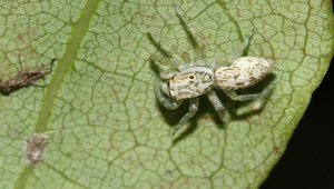 說明:圖為眼鏡黑條蠅虎雌蛛。雌蛛體長約5-6mm。背甲白色或乳白色,胸部背面具有明顯眼鏡狀斑紋,非常容易辨認。雄蛛體型略小,約4-6mm,背甲則為黑褐色,側緣與後緣具有白邊,腹部背面黃褐色,中央具有一條寬大的縱帶。雌雄蛛因體色差異大,常被誤認為不同種。分佈於低海拔地區,經常於枝葉間徘徊漫遊尋找獵物。在樹葉間築巢。