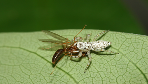 說明:圖為眼鏡黑條蠅虎雌蛛,正在補食蜂類。雌蛛體長約5-6mm。背甲白色或乳白色,胸部背面具有明顯眼鏡狀斑紋,非常容易辨認。雄蛛體型略小,約4-6mm,背甲則為黑褐色,側緣與後緣具有白邊,腹部背面黃褐色,中央具有一條寬大的縱帶。雌雄蛛因體色差異大,常被誤認為不同種。分佈於低海拔地區,經常於枝葉間徘徊漫遊尋找獵物。在樹葉間築巢。