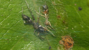 說明:圖為黑色蟻蛛雌蛛,剛在絲室中蛻完皮。蟻蛛體色從黑色至褐色都有,但以黑褐色較常見。蟻蛛類身體細長,第一步足經常向上抬舉揮舞,狀似螞蟻觸角,加上顏色與體型近似螞蟻,所以得名。分佈於低海拔地區,經常於枝葉間徘徊漫遊尋找獵物。會在樹葉背面或在葉片間築成絲室以為巢。