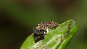 說明:圖為寬胸蠅虎雌蛛,正在捕食蛾類。雄蛛體長約4-6mm,雌蛛體長約6-8mm,體色變化很大,但是藉由腹部背方三條細橫紋,比較容易和他種區別。分佈台灣低海拔地區,平常喜歡在葉間徘徊尋找獵物,也會利用樹皮裂縫或樹葉織綴成巢。