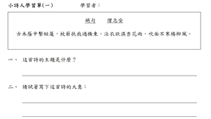 唐詩學習單,每詩ㄧ張,針對詩的主題或詩人做延伸提問或寫作。