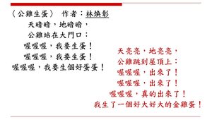 以林煥彰先生的童詩「公雞生蛋」為朗頌文本,敎孩子學習朗誦。