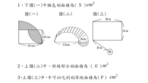 學習內容:S-6-3 圓周率、圓周長、圓面積、扇形面積:用分割說明圓面積公式。求扇形弧長與面積。知道以下三個比相等:(1)圓心角:360;(2)扇形弧長:圓周長;(3)扇形面積:圓面積,但應用問題只處理用(1)求弧長或面積。