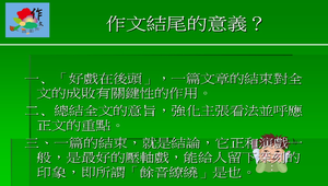一篇出色的文章除了要有鳳頭般的美麗之外,能否與主題契合且和開頭相互輝映之結尾更是功不可沒。雖然老師在教學上殷殷期盼的希望是如此:漂亮的開頭,流暢的中間,紮實的結尾才能震撼人心,感動讀者令人回味無窮的「完美結局」,但實務上仍發現許多孩子因忽略結尾的重要性及運用,所以往往只寫了一二段或者如打陀螺似的重複描寫,甚至偏離了主題,實在相當可惜! 如何啟發助孩子一臂之力?有那些合適的策略及方法輔助寫作的結尾?繼孩子們在認識了從審題、選材、架構及開頭之後,著手本設計,盼重拾孩子們在課堂上累積的舊經驗,啟發寫作「如何結尾」的基本概念。 本教案設計,整理出常見之十種寫作結尾方法,提供教學參考及輔助孩子們實際寫作困境-「完美結局」之改善。