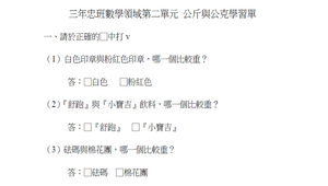 學習內容:N-3-16 重量:「公斤」、「公克」。實測、量感、估測與計算。單位換算。