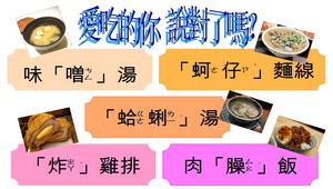 人們對於生活中常見的小吃常有誤讀,製作成精美的海報,貼於校園,學生每經過一次就看一次,使學生自然記起正確讀音。