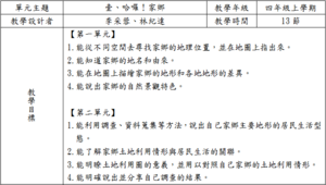 「哈囉!家鄉」教學目標:讓學生能從不同空間尋找出家鄉的地理位置,並知道家鄉的地名、由來、地形及自然景觀特色,接著再利用資料蒐集技巧與簡報技巧來描述家鄉主要地形的居民生活型態、土地利用情形與居民生活關聯等。