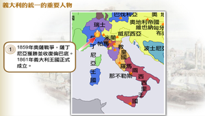 1859年奧薩戰爭,薩丁尼亞獲勝並收復倫巴底。1861年義大利王國正式成立。1866年普奧戰爭,義大利取得威尼西亞。1870年普法戰爭,義大利軍隊趁法國撤軍進軍羅馬。