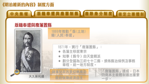 制度方面的革新:中央集權、 版籍奉還與廢藩置縣 、廢除身分制度 、確定立憲體制。