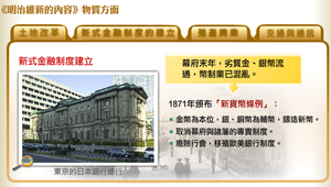物質方面的革新:土地改革、殖產興業 、新式金融制度的建立、交通與通訊。