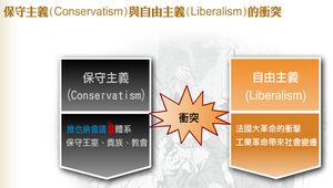 19世紀前期,拿破崙戰爭中,象徵專制舊勢力的國家獲勝,隨之也召開維也納會議,保護王室、貴族、教會等既得利益階級。另一方面,從法國大革命、拿破崙戰爭及工業革命以來,自由觀念隨著政治社會運動四處傳播。19世紀初期,出現保守主義與自由主義的對抗衝突。