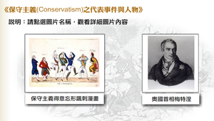保守主義之代表事件與人物:保守主義得意忘形諷刺漫畫與奧國首相梅特涅。