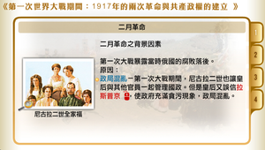 第一次世界大戰爆發,使得俄國社會經濟問題更加凸顯。1917年二月革命的導火線主要有以下兩點:一、國會要求改革,沙皇拒絕;二、趁民變而政變。最後人民推翻沙皇,組織臨時政府。
