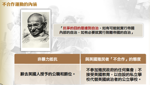 為了團結印度人民反抗英國政權,甘地依賴國大黨協助,贏得黨內對非暴力手段的支持。整體來說,甘地的「非暴力不合作運動」包含兩方面:「非暴力抵抗」和與英國殖民者「不合作」的態度。具體內容有:辭去英國人授予的公職和爵位;不參加殖民政府的任何集會;不接受英國教育,以自設的私立學校代替英國統治者的公立學校等。