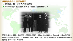 1918年第一次世界大戰結束。於隔年1919年召開巴黎和會,簽訂《凡爾賽條約》。和會實際上被美國總統伍德羅.威爾遜、英國首相勞合.喬治、法國總理克里.蒙梭三人所操縱,被稱為巴黎和會三巨頭。《凡爾賽條約》對戰敗國的戰爭賠款數字過於龐大,戰敗國不堪負荷,嚴重阻礙歐洲戰後的重建,造成了經濟大恐慌,國際經濟一決不振。華爾街股市崩盤,各國工廠倒閉,在此衝擊,導致了極權政府德日義的產生。