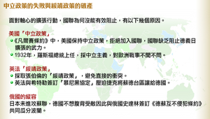 在《凡爾賽條約》中,美國保持中立政策,拒絕加入國聯,造成國聯有名無實的窘境。缺乏阻止德義日擴張的武力。而1932年羅斯福總統上任後仍然採取中立政策。又英法對?採取張伯倫的「綏靖政策」,避免直接的衝突,英法與希特勒簽訂「慕尼黑協定」壓迫捷克將蘇德台區讓給德國 。又日本並未進攻蘇聯,德國不想腹背受敵因此與俄國史達林簽訂《德蘇互不侵犯條約》共同瓜分波蘭。 英、法、美、蘇等國為了各自的利益,採取了綏靖、觀望與縱容的消極政策,助長了軸心國的氣燄。 使得軸心國的勢力日益高漲。