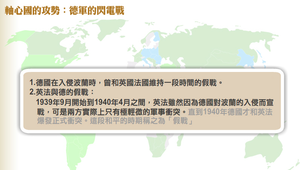 第二次世界大戰爆發,軸心國以迅雷不及掩耳的速度攻占世界,以下將從德國的閃電戰,德義占領巴爾幹與日本偷襲珍珠港三個方向做探討。大戰當中德國大量使用戰車及空軍進行閃電戰。首先入侵波蘭,之後因東邊有《德蘇互不侵犯條約》,德國將目標鎖定在英法所在地的西歐。以閃電戰進攻法國,短短六星期就讓法國體會到亡國恥辱。在德國攻陷西歐同時,義大利展開對外的侵略;最後巴爾幹半島落入軸心國手中,希特勒無後顧之憂地對蘇聯發動攻擊。亞洲方面,1941年12月7日,日本突襲珍珠港,同時發動東南亞戰爭。美國因損失大量戰艦,正式對日宣戰。