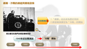 1946年5月,邱吉爾應邀到杜魯門總統家鄉富爾頓的西敏寺學院受頒榮譽學位,並透過電視對美、英等國民眾演講,「鐵幕」從此成為歷史用詞,俄國史家將這場演講定為「冷戰」的開始。針對當時歐洲變局的情勢,當時英國外交官喬治‧肯楠指出歐洲變局是蘇聯蠻橫所造成。1947年7月,肯楠發表〈蘇聯行為的根源〉,認為要擊敗蘇聯就得採取堅強圍堵的政策,「圍堵」一詞首度出現。
