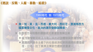1960至1970年代,美、加、英、法、西德、義大利、西班牙、澳洲等西方國家爆發文化、政治的激烈變動與陣痛,各種理念與相應的運動彼此激盪並推陳出新,猛力撞擊戰間期及冷戰以來的政治體制與意識形態,嚴厲批判資本主義下的社會經濟框架與過時的價值倫理。從加州、墨西哥,到波蘭、南斯拉夫,各地同時發生社會運動,多數以學生為主力,形成全球性的學生運動,他們最初主要訴求是反越戰、反核戰,而與他們呼應激盪的有爭取平權的美國黑人、原住民與女性主義者,以及新左派知識分子等。1968年,激情叛逆達到顛峰。