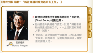介紹雷根在競選加州州長時喊出的「將社會福利的懶鬼送回去工作」相關內容:雷根大肆撻伐民主黨詹森總統的「大社會」福利政策。他的首任州長競選口號之一就是「將社會福利的懶鬼送回去工作」,一上任就宣布凍結人事、減稅。他認為基於美國的立國精神,政府不應控管經濟,因為政府一旦開始控管經濟,就會進而控管人民。雷根1962年轉入共和黨,傾向自由經濟哲學,認為政府不應介入民間企業經營。面臨1970年代中後期以後的西方工業先進國家的經濟大衰退,雷根堅持自由經濟路線。