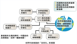 1971年美元危機使世界匯率改為浮動匯率;1974年石油危機,在世界經濟的震動中使的各國間的協商顯得更為重要,跨國企業成長、區域聯合的經濟圈逐漸發展。經濟世界化使亞非各國陸續接觸西方文化;然而,為國際債務所苦的非洲則面臨糧食危機擴大的問題。而世界科技進展也使政治世界化形成,冷戰的結束,東歐與蘇聯陸續解體、東西德統一,象徵資本主義的勝利,中國走向改革開放,世界一體的現象更為明顯。