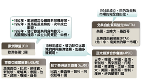 1994年美國、加拿大發起 成立北美自由貿易協定(NAFTA),主要目的為金融市場的完全自由化。歐盟的形成由1952年歐洲煤炭及鋼鐵共同體(ECSC)便逐漸展開,1992年簽署馬斯垂克條約而再次年成立歐盟,1999年發行歐盟共同貨幣歐元,各國也開放邊界,成立歐盟國的共同簽証─申根。