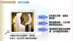 「全球化」的優點:訊息廣泛流傳,知識流通加速、關稅壁壘消除,人民可選擇更便宜的商品、增加開發中國家的就業機會,如中國經濟的興起。