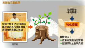 在改革官制方面,太祖將唐代的中書、門下、尚書,三省合併為「中書府」。樞密院,掌理全國軍務,長官為樞密使,樞密院與中書府分掌軍、政,號為「兩府」。宋初的政制採軍、政、財三權分立,大權則統於皇帝。宋代的官制採官職分離的原則,官只用以定品級俸祿,有官職者未必有權。地方官制有路、州、縣三級制,本地官並無實權,皇帝派去的知州、知府、知縣等差遣官,才是實際的地方官。
