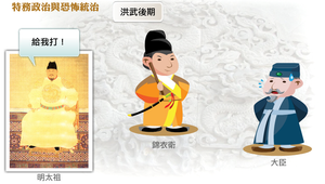 明太祖為使臣僚對其絕對忠誠,時常採用特務手段偵察臣僚言行。洪武初年,以高見賢等人任『檢校』職,專負責察聽在京大小衙門官吏的不公不法,以及各種風聞的流言。洪武15年,又進一步設立錦衣衛,專司偵察、審判、處刑。洪武後期,明太祖還時常在朝廷上杖責大臣,稱為廷杖,重者立斃杖下。