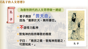 孔子一生經歷了春秋末世,其思想言行可以為春秋時代的人文思想做一總結。他認為君子應該「畏天命」,孔子雖然畏天敬神,但他罕言天道,不語怪力亂神,知生事人,重視現實人世的胸懷,都是中國古代人文精神的典型。