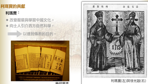 瑪竇向士人引介西方自然科學,以達到傳教的目的。由於耶穌會對教士陶成教育的要求頗為嚴格,兼具人文素養與科學訓練的耶穌會傳教士,藉著西方科學新知,如:西洋器物 、世界地圖、地圓說、幾何學等作為傳播天主教的「敲門磚」。利瑪竇與當時京師高官名流交往,如:徐光啟、李之藻及及曾任御史的楊廷筠等,這些人士改信天主教,不但能幫助教務的拓展,且使西洋傳教士正式參與朝廷修訂曆法的工作。