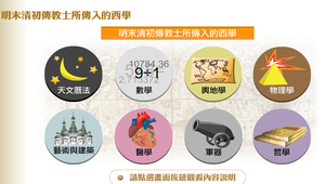 明末到清初這段時間,由耶穌會傳教士傳入許多的西學,這些西學有天文曆法 ,數學 ,輿地學 ,物理學 ,藝術與建築 ,醫學 ,軍器 ,哲學。
