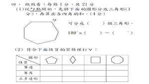 學習內容:S-5-1 三角形與四邊形的性質:操作活動與簡單推理。含三角形三內角和為 180 度。三角形任意兩邊和大於第三邊。平行四邊形的對邊相等、對角相等。