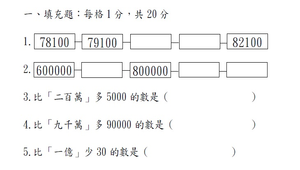 學習內容:N-4-1 一億以內的數:位值單位「萬」、「十萬」、「百萬」、「千萬」。建立應用大數時之計算習慣,如「 30 萬1200」與「21 萬 300」的加減法。