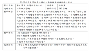 自人類有文明以來,生命就不再只是吃飽喝足而已,所謂的「禮俗」就是一群人共同遵守實行的禮儀與習俗,有的成為儀式;有的轉化成吉祥符號,有的轉變成慶典,有的融入生活中成為生命禮俗,重視禮俗也就代表重視生命的態度,也代表了祖先的信仰和價值觀,隨著時代進步,許多繁文縟節也都被簡化,但不變的是對生命的尊重與祝福。藉由單元教學學生從傳統習俗中了解過去的文化,體會習俗背後的意義,也進而探討禮俗的變與不變在社會文化上的意義。