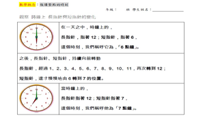學習內容:N-2-13 鐘面的時刻:以操作活動為主。以鐘面時針與分針之位置認識「幾時幾分」。含兩整時時刻之間的整時點數(時間加減的前置經驗)。