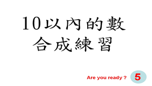 內容為「十以內的數」合成練習,可在班級內進行搶答競賽,亦可做為學生個別練習之用。透過投影片母片中倒數計時秒數的調整,可加快學生回答的速度,提高熟練度。