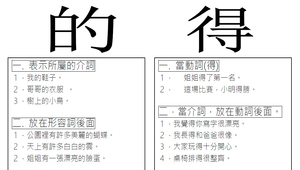 小朋友對於"的"和"得"的使用時機,常常會搞不清楚,所以可配合課程發下補充教材給學生,讓他們能更清楚何時該用何字!