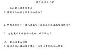 藉由書包減重學習單,讓孩子瞭解書包應放那些東西,書包減重的好處,進而讓孩子能付諸行動,進行書包減重。