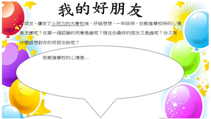 我的好朋友學習單設計適用於閱讀課,小朋友讀完小阿力的大學校這本繪本後,雖然繪本內容所描述為一位一年級新生即將入學的緊張心情,但亦適合二年級小朋友閱讀。繪本可以讓孩子仔細回想當時剛近一年級時是什麼心情,如何交到好朋友,如何融入班級生活,也可以讓孩子在即將面臨第一次(二年級生三年級)分班前調適好心情,並將心裡的想法寫在學習單上。學習單中「剛進學校的心情…」與「我想跟我的好朋友說…」的回答,教師要鼓勵小朋友以完整語句描述,避免單句形容詞,如:很開心、很緊張,進而訓練孩子完整語句敘寫能力。