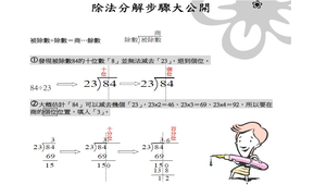 在教到商為小數的除法時,許多小朋友備感困難,透過此分解步驟,教導孩子一步驟一步驟的處理,了解困難除法的詳細步驟。