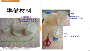 小朋友,我們也可以利用醋和小蘇打粉製作簡易的滅火器喔!醋和小蘇打粉作用後會產生二氧化碳,因為二氧化碳不會助燃,加上醋和小蘇打粉所產生的泡沫和液體可以降低燃點,所以,可以用來製作簡易的滅火器喔!現在就讓我們動手做做看吧!