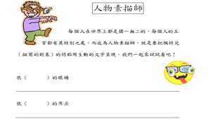 這堂課其實是一堂練習「視覺摹寫」的課程,老師可以先讓孩子觀察彼此的五官,透過彼此腦力激盪與發表,掌握每個人不同的外型特色,再將其寫出。如果孩子覺得有困難,老師可以先準備一些形象突出的卡通人物圖片作為預備,先以卡通人物作為觀察對象,再延伸至真正的人。
