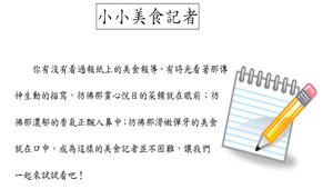 這堂課其實是一堂練習「視覺摹寫」與「味覺摹寫」的課程,老師先準備三到四種口感、香氣、味道各異的小零嘴,讓幾個孩子上台透過看與品嚐,向台下的學生描述其外形與口感,讓台下學生猜一猜他們吃的到底是什麼。最後,老師準備不同的小零嘴,讓每個學生一樣一樣仔細觀看外形,最後細細品嚐味道,寫出他們獨一無二的美食報導。